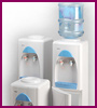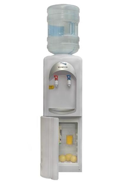 Dystrybutor zimnej oraz ciepłej wody wraz z małą wbudowana lodówką.