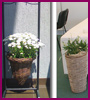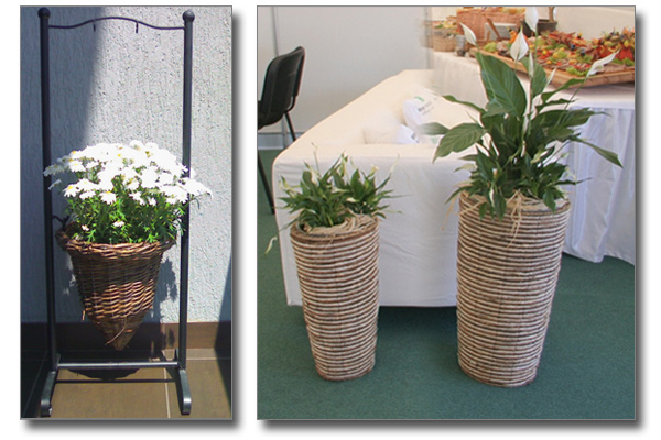Stojaki metalowe z koszami wiklinowymi na kwiaty oraz stojaki wiklinowe na kwiaty doniczkowe lub kompozycje kwiatów.